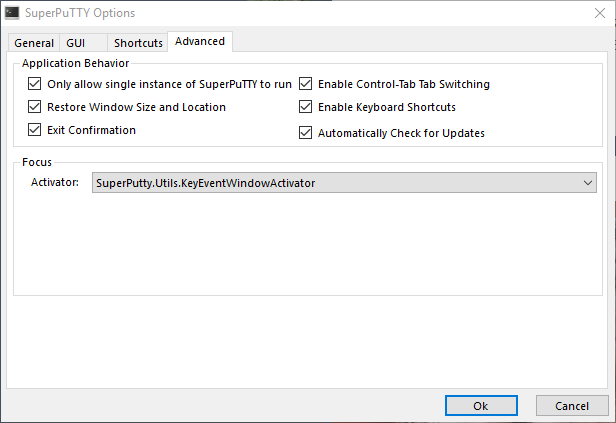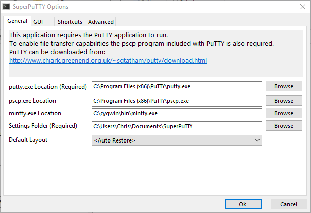 First, ensure that both SuperPuTTY and PuTTY are installed and configured correctly. Your SuperPuTTY options should be configure similar to mine such that SuperPuTTY knows where the PuTTY executable file is located: