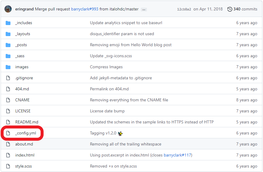 At the homagepage of your repository, you will see a list of files in the middle pane. Locate the _config.yml file in the middle pane. This is a configuration file for Jekyll, which we need to edit. Left click on the _config.yml file. An example is below with the _config.yml file highlighted in red.