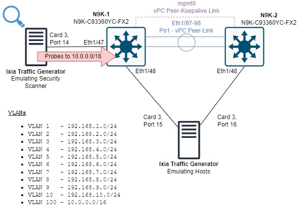This topology has a total of eleven VLANs - VLANs 1-10, and VLAN 100. N9K-1 and N9K-2 are running HSRP (Hot Standby Router Protocol) and are both acting as gateways for each VLAN (as both vPC peers can act as gateways for vPC VLANs). Card 3 Port 15 of the Ixia emulates hosts in VLAN1-10, with one host per VLAN. Each host has an IP address ending in .10 (so 192.168.1.10 in VLAN 1, 192.168.2.10 in VLAN 2, etc.) Card 3 Port 16 of the Ixia emulates hosts identically, except each host has an IP address ending in .20 (so 192.168.1.20 in VLAN 1, 192.168.2.20 in VLAN 2, etc.). This emulates legitimate hosts in our production network, and each port sends traffic in a full-mesh manner such that our emulated production network has both intra-VLAN and inter-VLAN traffic flowing through both Nexus switches.