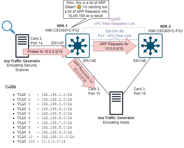 At first glance, this may not make sense. Both Nexus switches had a populated ARP table before the security scanner traffic started. When an ARP entry gets close to expiring, the Nexus should attempt to proactively refresh that entry by sending an ARP request for that IP to confirm the same IP/MAC binding is still valid. This traffic is ARP traffic, which should fall under the “copp-system-p-class-normal” CoPP class-map, not the Glean-focused “copp-system-p-class-l3uc-data”.