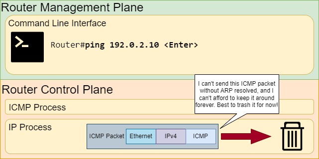 This means the network device would need to allocate a minimum of 114 bytes of system memory (potentially more, if metadata about the packet needs to be stored) to buffer the ICMP packet while ARP resolves. This packet would need to be buffered in system memory for the ICMP timeout period (default 2 seconds on Cisco IOS-XE) while the router tries to resolve ARP for the destination.