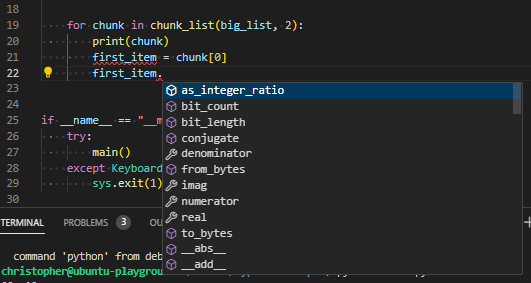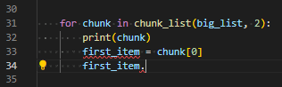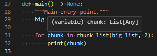 The real power from our use of generics comes when we interact with the chunk variable. If we hover over it, we see that it’s of type List[int] now, not a type of List[Any].