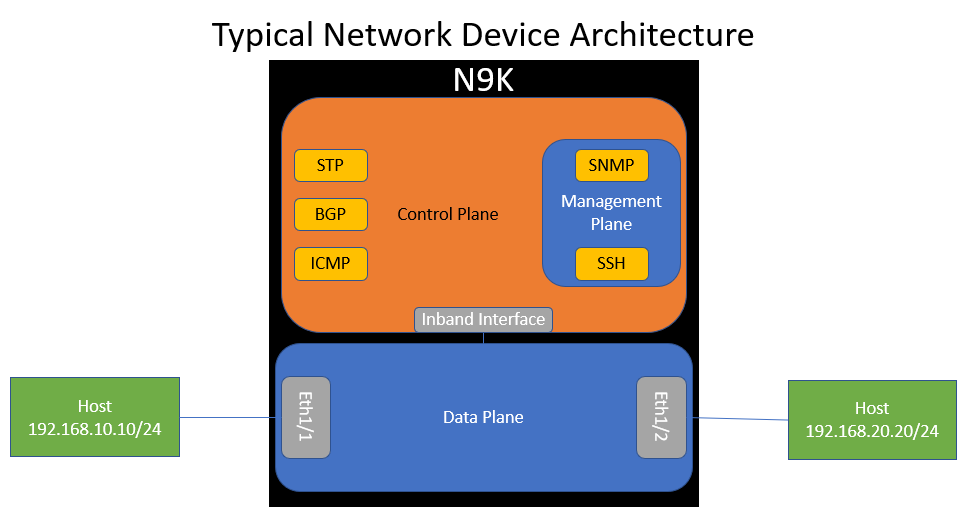 A practical example of management plane traffic in our topology is SSH traffic destined to the network device itself. If the network device receives an ICMP Echo Request packet destined to an IP address of 192.168.10.1 (which the network device is assigned), the data plane will recognize that the network device itself owns this IP address and forward the packet to the control plane’s inband interface. This action is called a “punt”.